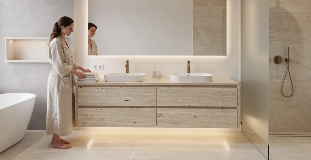 La pierre naturelle occupe une place de choix dans une salle de bain minimaliste et relaxante. Le travertin, avec ses nuances beiges et ses légères aspérités, évoque les thermes antiques tout en restant d’une grande modernité. Utilisé en carrelage de sol ou en faïence murale, il offre un toucher doux et une esthétique chaleureuse, particulièrement appréciée dans un espace dédié à la détente. Ses variations naturelles créent un décor vivant tout en restant parfaitement sobre.